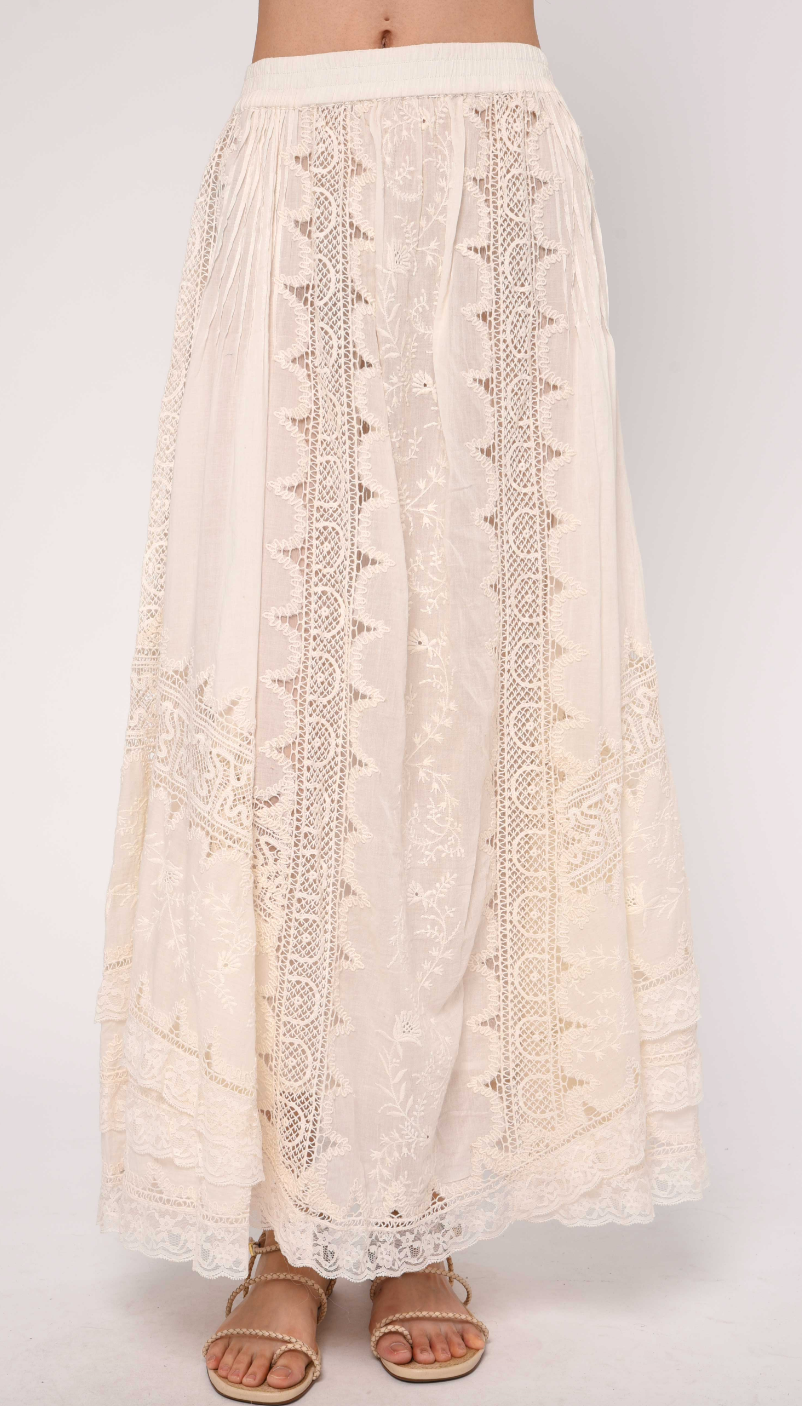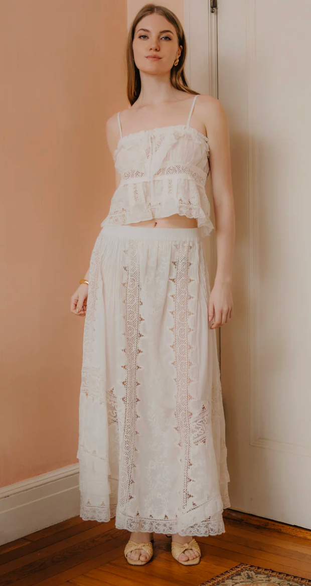 The Marlow Maxi Skirt in Ivory is our designer’s favorite this season. Crafted from lightweight cotton and adorned with crochet lace and embroidery, a bohemian, vintage-inspired piece.