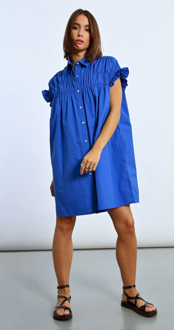 Shirt dress -Short ruffled sleeves -Blouse collar -Straight cut -Gathers on the bust -Button closure along the entire front